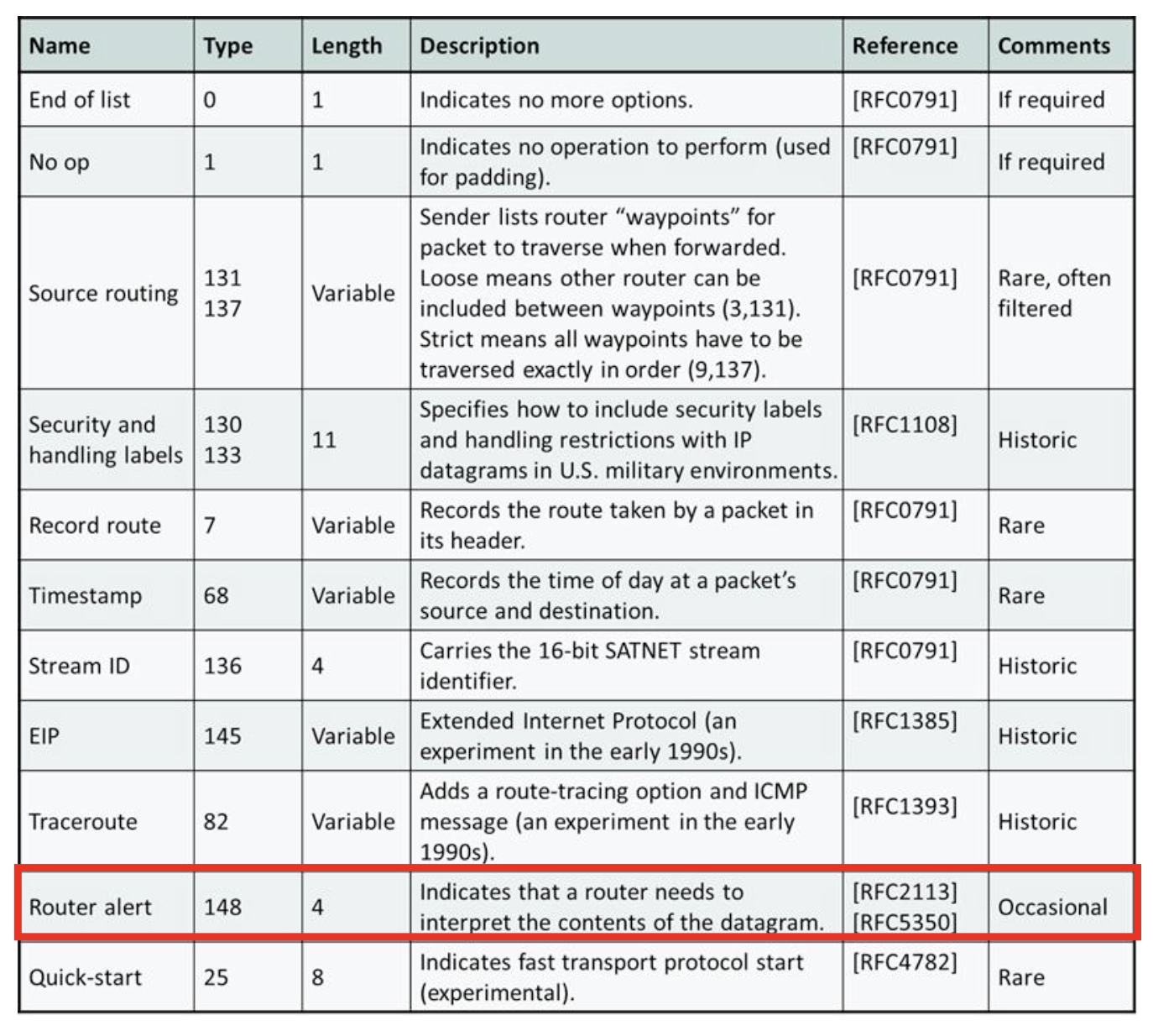 - 예외적으로 Router Alert, Loose Source Routing 등만 제한적 허용.
