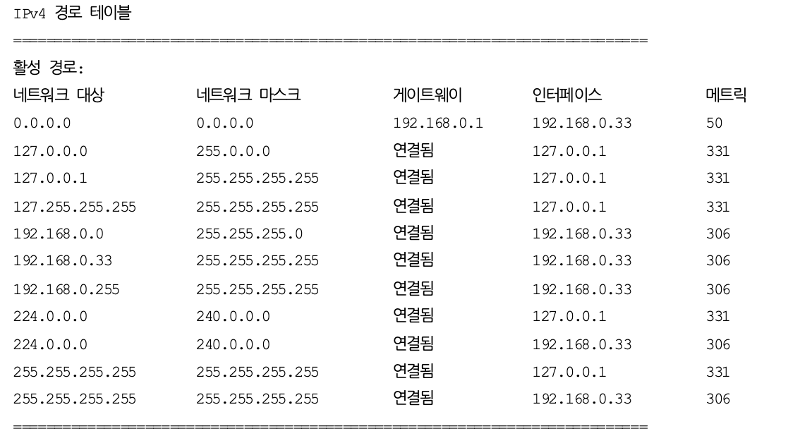 - 출력: 출력 인터페이스, 다음 홉 IP주소(공유형 링크에서 필요)