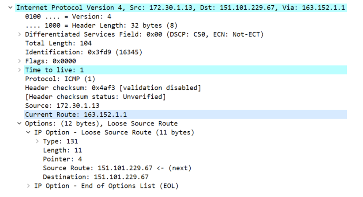 | - IHL = 8 (32 B) → 옵션 12 B 포함 - TTL = 1 → 첫 라우터에서 ICMP Time‑Exceeded 유도 (traceroute ‑j) - Current Route = 163.152.1.1 - Route List = 151.101.229.67 (다음 홉) |