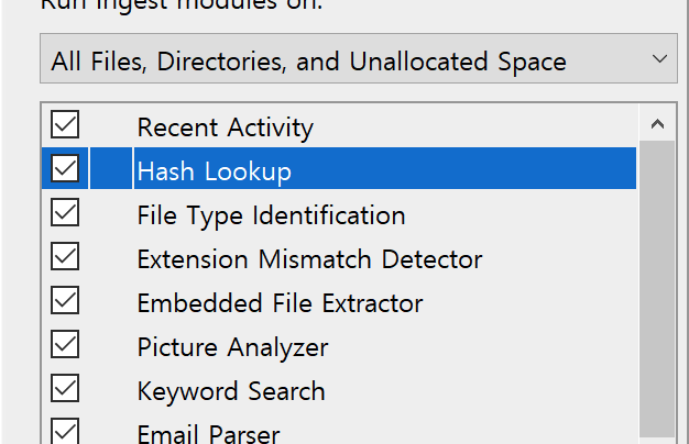 윈도우 디지털 포렌식 툴(Autopsy)에서 이미지 조사 시 Hash Lookup Module이 있어도 해시 필드가 비어 있음.
