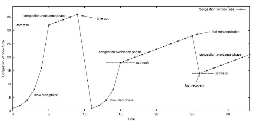 현대의 TCP 혼잡제어 알고리즘은 더 진보했지만, 10가지가 넘는 변종으로 뿔뿔이 각개 약진을 하기 때문에, 뿌리가 되는 4가지의 알고리즘만 파악해볼 것이다