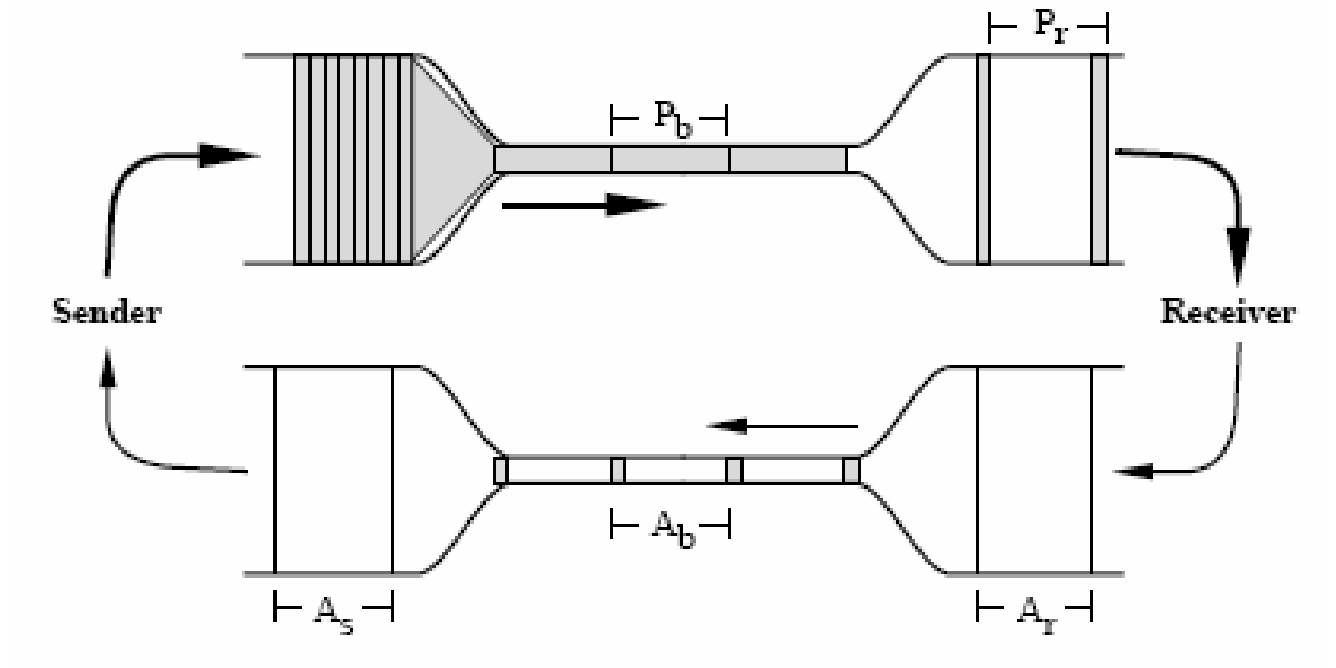 TCP self-clocking $ P_b $는 병목에서의 데이터 세그먼트 간격 $ P_r $은 병목 아닌 구간에서의 세그먼트 간격($=P_b$) $ A_r $은 ACK 간격