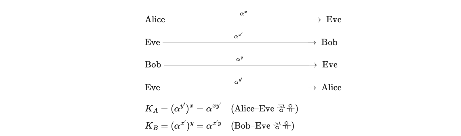 공격자 Eve가 Alice와 Bob 사이에서 각자 다른 지수($g^{x'}, g^{y'}$)를 삽입하면, Alice-Eve, Eve-Bob 간에 서로 다른 세션 키가 형성되고 Eve가 둘 다 알게 된다.