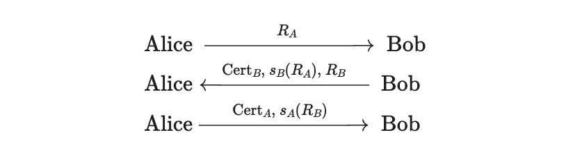 - Bob은 세 번째 메시지를 수신할 때, Alice의 증명서$Cert_A$에 포함된 $\alpha_A,p_A$와 첫 메시지에서 보낸$\alpha_A,p_A$가 일치하는지 검증.