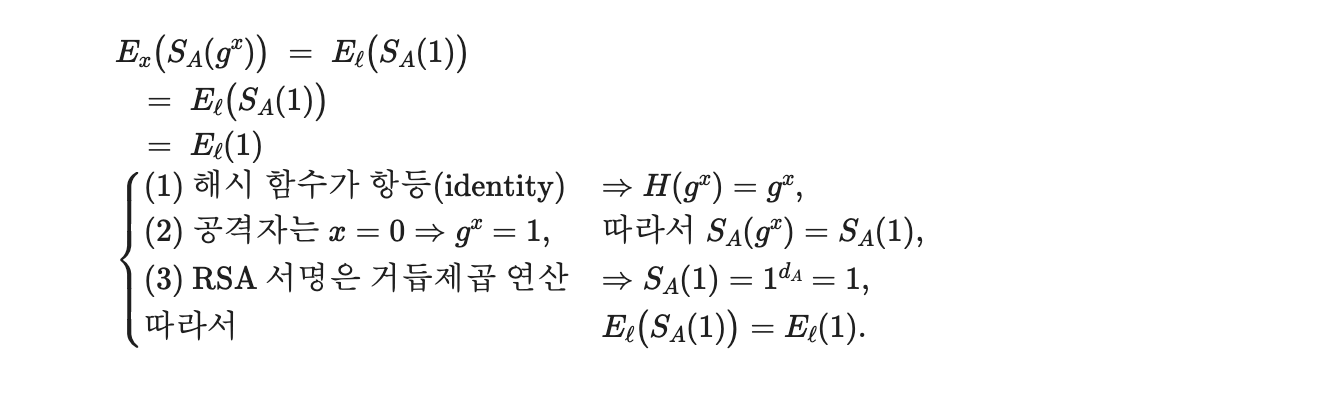 - 신원 문제: Alice가 이번 실행(run)의 지수쌍(그중 하나는 Bob이 이번 실행을 위해 막 생성)을 서명했으므로, 서명은 해당 실행에 결박