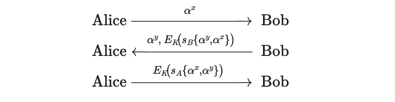 Modified STS: Alice는 , Bob은 $E_K!\big(s_B{\alpha^y}\big)$