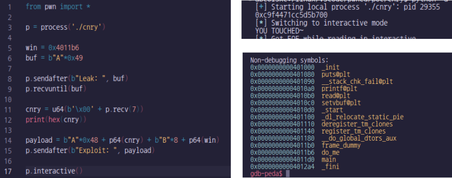 우리는 Leak된 Canary를 받아주고 다음 buf 입력때 0x48 + Canary(8) + SFP(8) + do_me(8)를 넣어주면 카나리 검사를 통과하고 실행흐름을 조작할 수 있습니다.