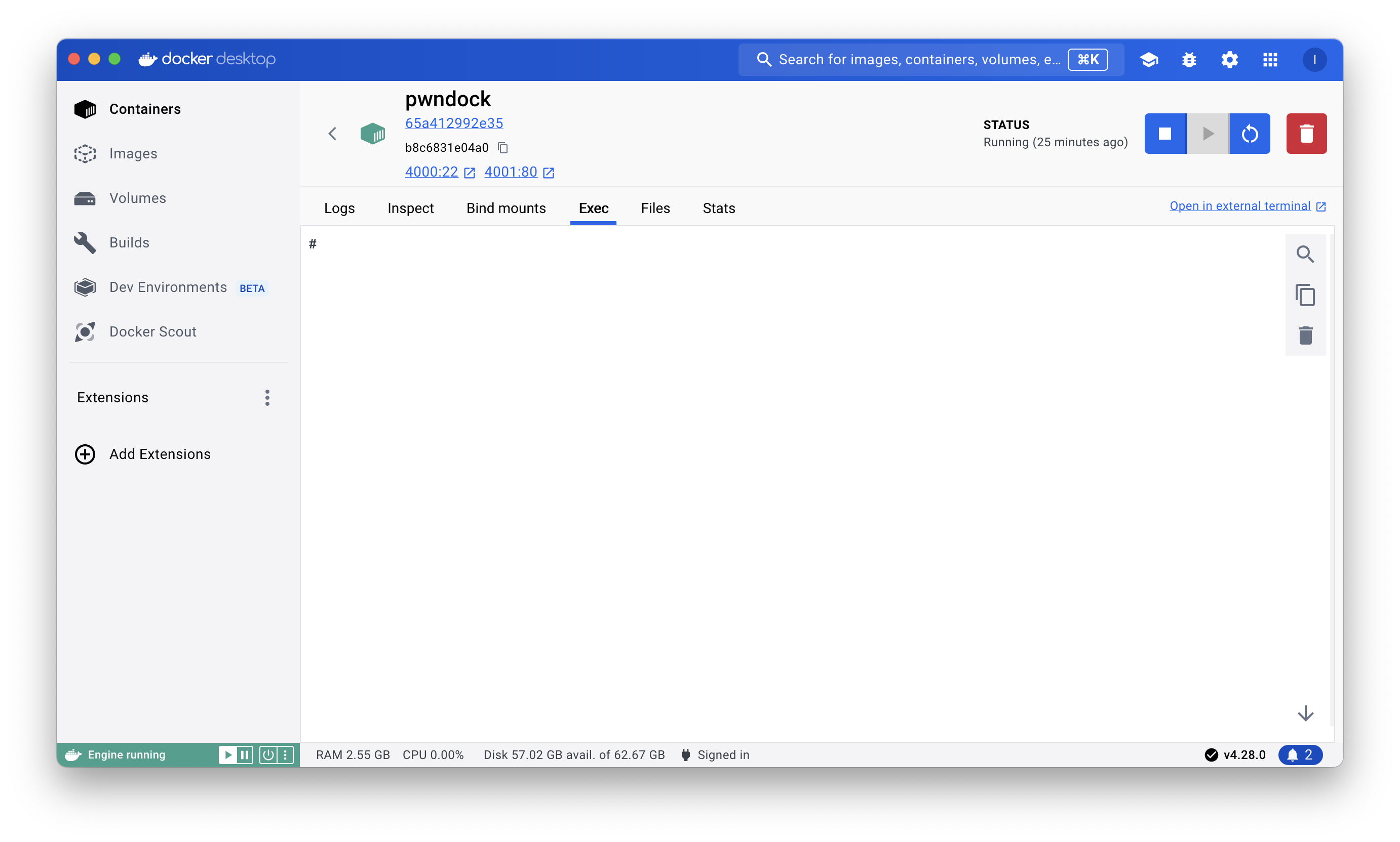 docker exec 명령어로 들어가도 됩니다. docker desktop을 사용한다면 그냥 여기서 여는게 편합니다.