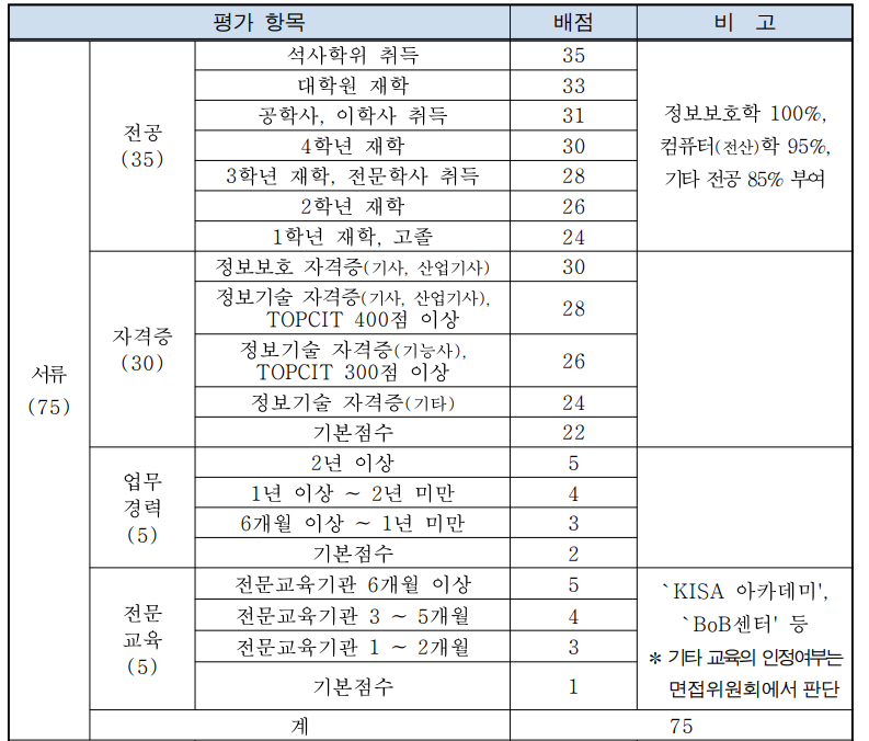 | 정보보호병 | 지원 자격 : 다음 자격요건 중 한가지 이상을 충족하는 자 전공 4년제 대학교 또는 전문대학에서 정보보호 및 컴퓨터(전산) 관련학과 전공자 (1년 수료 이상) 고등학교 졸업자 중 정보보호 또는 컴퓨터(전산)학과 전공자 자격증 정보보호 : 정보보안기사·산업기사, 정보보호관리자(CISM) 등 정보기술 : 정보처리기사·산업기사, 사무자동화기사·산업기사 등 IT 역량지수(TOPCIT) 정기평가 300점이상 획득자 업무경력 : 공공, 민간기관 정보보호 업무경력(3개월 이상자) 전문교육 : BoB센터 "차세대 보안리더 양성 프로그램" 과정 선발자 선발 단계 1차 전형 : 전공(30) + 자격증(20) + 업무경력(10) + 출결(5)의 합계 고득점자 순 300% 선발 2차 전형 : 전문교육(5) + 면접(30) 최종 선발 : 1차 점수 + 2차 점수 합계 고득점자 순 |