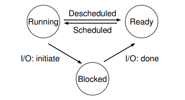 - Blocked : 프로세스가 실행할 준비가 되지 않은 상태 (e.g., I/O를 기다리고 있는 상태)