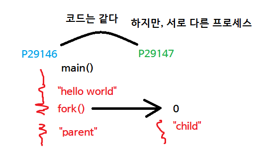 그림으로 설명하자면 fork()라는 함수 이후로 child 프로세스가 생기고 0을 반환한다.
