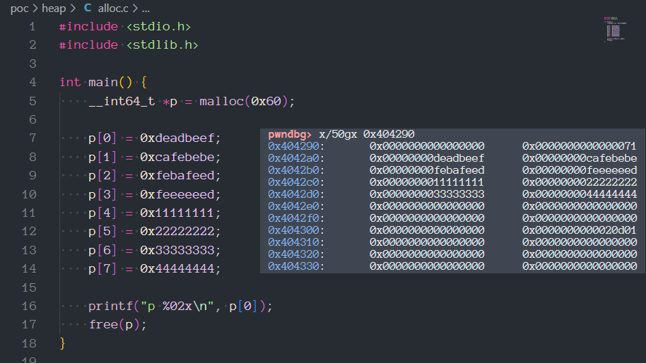 그냥 별 거 없는 useless한 코드이다. 0x60만큼 heap에 allocate하는 내용인데 직접 분석을 해보면 0x4042a0부터 우리가 넣은 데이터가 들어갔다. 하지만 그 위 0x404298엔 0x71이 들어가있는데 이는 ptmalloc이 allocated된 chunk를 관리하기 위한 방법이다.
