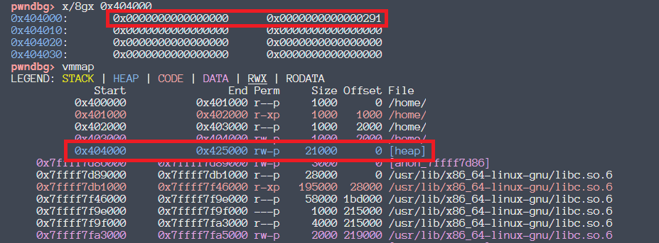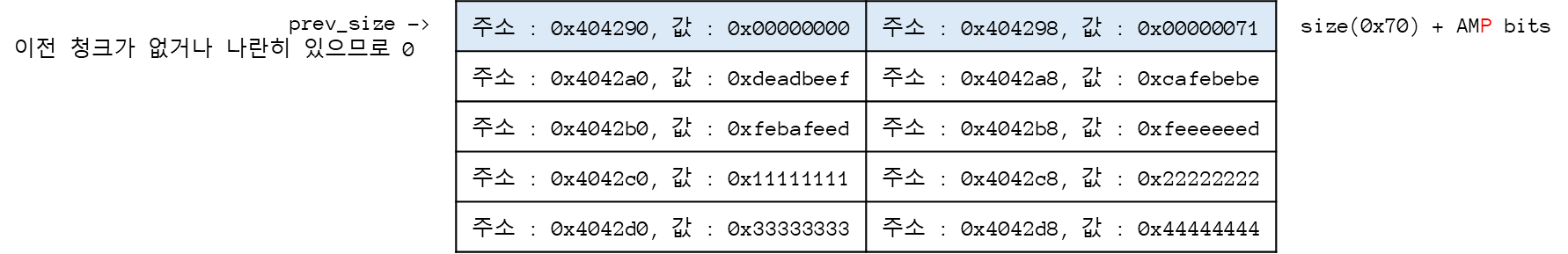 여기서 주소 0x404290부터의 8바이트는 prev_size이다.