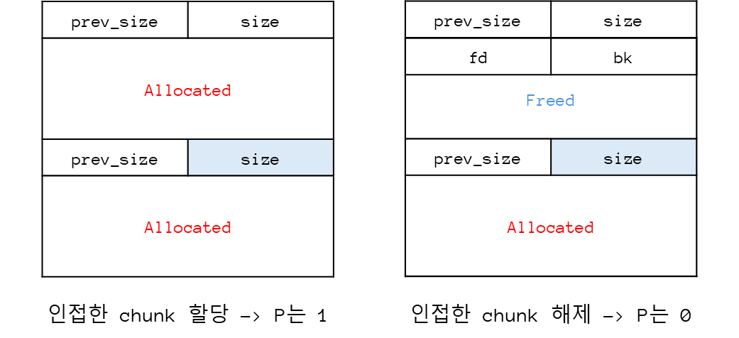 앞쪽 chunk가 free될 땐 앞 size가 현재의 prev_size에 초기화되게 된다.